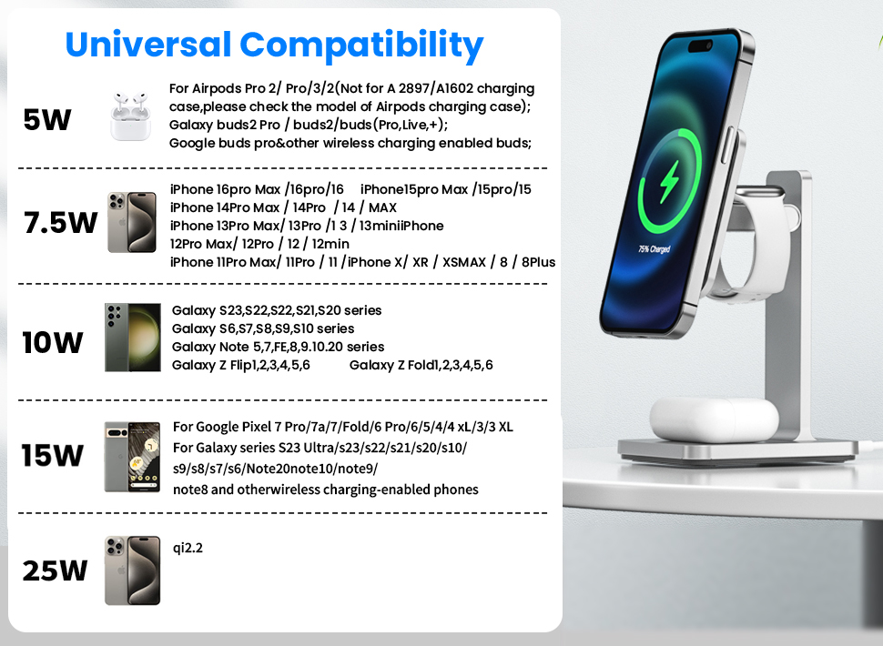 The first OEM factory to independently develop Qi 2.2 25W wireless fact charging on the market, charging speed is faster and mobile phones,watches can be charged at the same time,all in one stop, making the desktop tidier, Meet your device charging needs! more details see below: